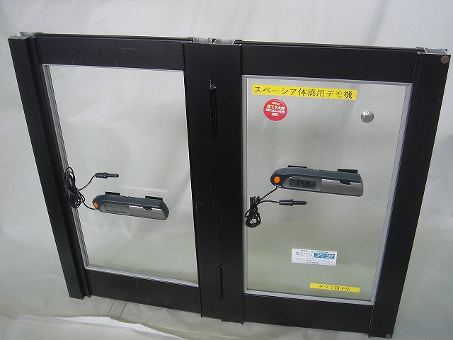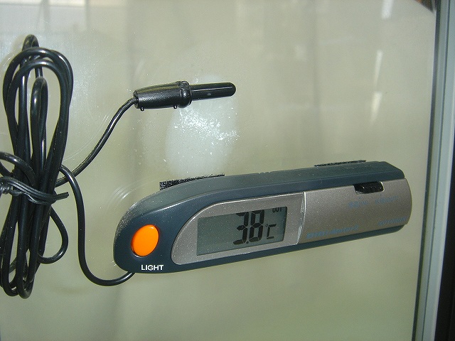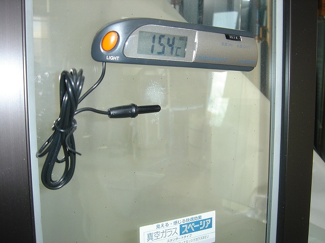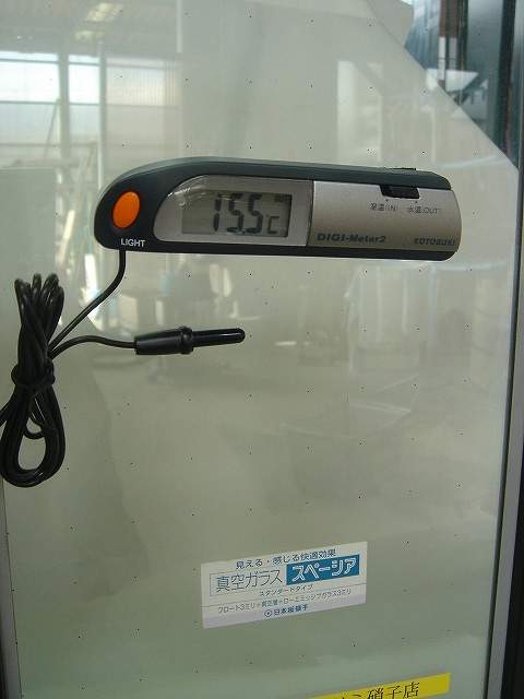 通常のサッシを加工して左の枠に3mmのガラス、右の枠にスペーシアを取り付け、それぞれの表面に水槽用の温度計を取り付けてあります。